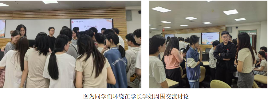 在互动问答环节中,大家三三两两地聚在一起深入交流。同学们结合自身实际,围绕各种关切问题积极提问;学长学姐们耐心解答并与大家互留了联系方式,表示乐意持续提供指导与帮助。教室里的讨论声此起彼伏,这场分享会就在这样自由而充实的氛围中圆满结束。
