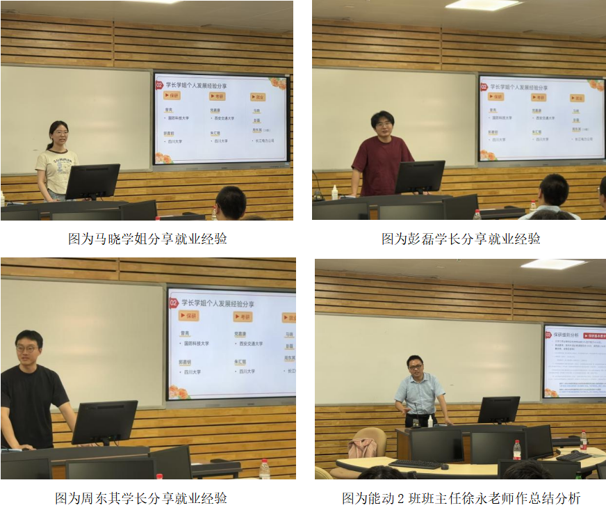 在就业经验分享环节,签约长江电力的三位学长学姐带来了职场的“第一手资料”。马晓学姐详细介绍了能源类国企的招聘流程和春秋招情况;彭磊学长则通过模拟面试场景,展示了如何应对HR的各种问题;已经入职一年的周东其学长介绍了他的工作环境、工作内容、未来升职情况等。这些都让大家对专业就业前景有了更立体、更具象的认知,也让那些对未来感到迷茫的同学重新燃起了奋斗的希望之火。