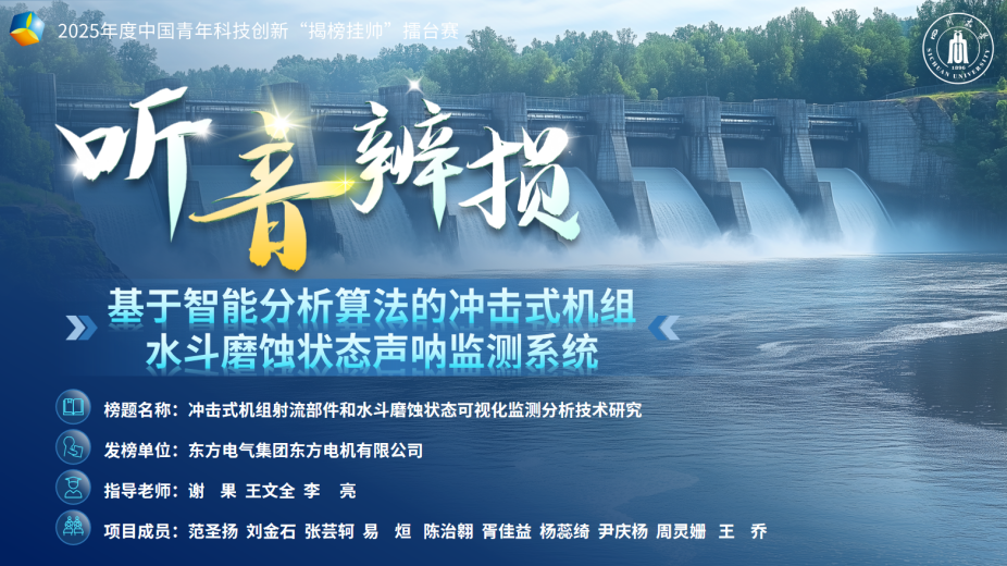 由谢果、王文全、李亮指导,范圣扬、刘金石、张芸轲等同学负责的“听音辨损——基于智能分析算法的冲击式机组水斗磨蚀状态声呐监测系统”项目荣获全国二等奖。项目针对提高冲击式水轮机的磨蚀监测系统备稳定性和准确性的技术难点,利用全向扫描声呐采集水斗磨蚀声呐数据,通过智能算法与实时监测技术实现目标识别与分析,结合神经网络算法,实现冲击式水轮机组水斗磨蚀区域自主识别、磨蚀程度自主判断、磨蚀趋势自主分析以及预警信息自主提示的功能,为全国重点水利工程保驾护航。