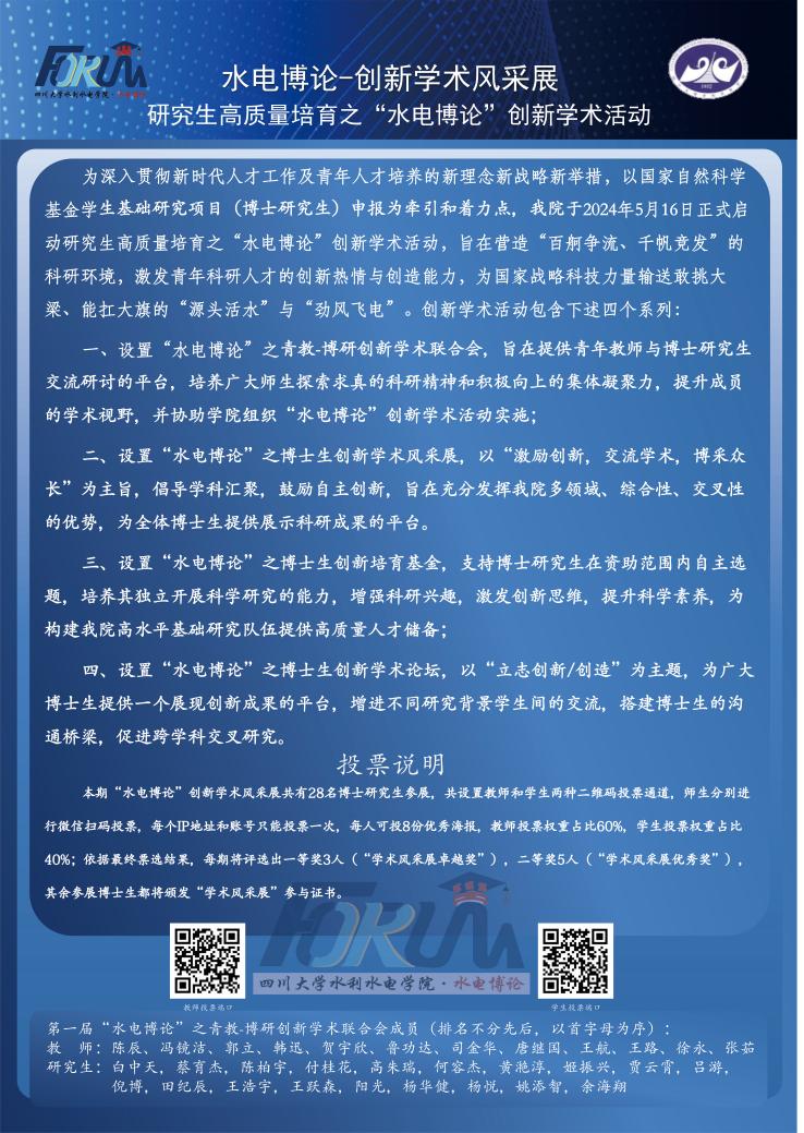 为深入贯彻新时代人才工作与青年人才培养的新理念、新战略、新举措,7m足球完场比分-7m足球情报 以国家自然科学基金学生基础研究项目(博士研究生)申报为重要牵引,于2024年5月正式启动“水电博论”系列创新学术活动。活动聚焦营造“百舸争流、千帆竞发”的科研创新生态,通过成立青教-博研创新学术联合会、举办博士生创新学术风采展、设立博士生创新培育基金、创建博士生创新学术论坛等四大核心板块,精准激发青年科研人才的创新热情与创造活力,为国家战略科技力量持续输送高素质“源头活水”。