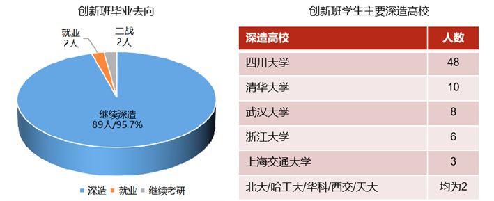 /国重室进一步优化了水利工程和土木工程两个一级学科的研究方向布局,制定了“深地与地下水利”国重创新班的本硕博贯通式人才培养方案,为创新班各专业学生深造提供更多选择和更大的成长空间,在已毕业93名创新班学生中(2021-2023届),升学深造89人,深造率达95.7%(其中:本校深造48人,占53.4%),有7名学生进入四川大学本硕博贯通式培养计划。