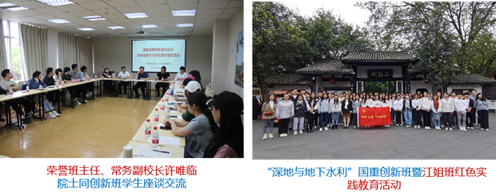 德能双育:提高学生综合素质,厚植家国情怀。国重创新班学生整体表现优异,综合素质高,事迹突出,292人次获国家奖学金、省级三好学生和优秀学生干部等奖励和荣誉(覆盖率近100%);通过专家座谈、学术讲座、社会实践等举措来增强学生家国情怀,创新班名誉班主任、许唯临院士与学生面对面交流,通过自身求学经历激励创新班学生坚持素质培养和能力提升并重。2020级“深地与地下水利”国重创新班入选四川大学“江姐班”,创新班班长张钰参加“把青春华章写在祖国大地上”大思政课网络主题宣传活动。